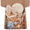 This custom baby gift set includes a wooden brush engraved with the baby’s name, a silicone pacifier, and a matching anti-drop teether chain. Thoughtfully designed with natural materials and a personal touch, it's a perfect keepsake for baby showers or newborn gifts.